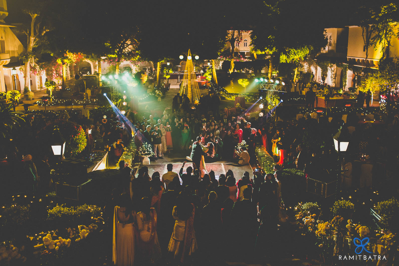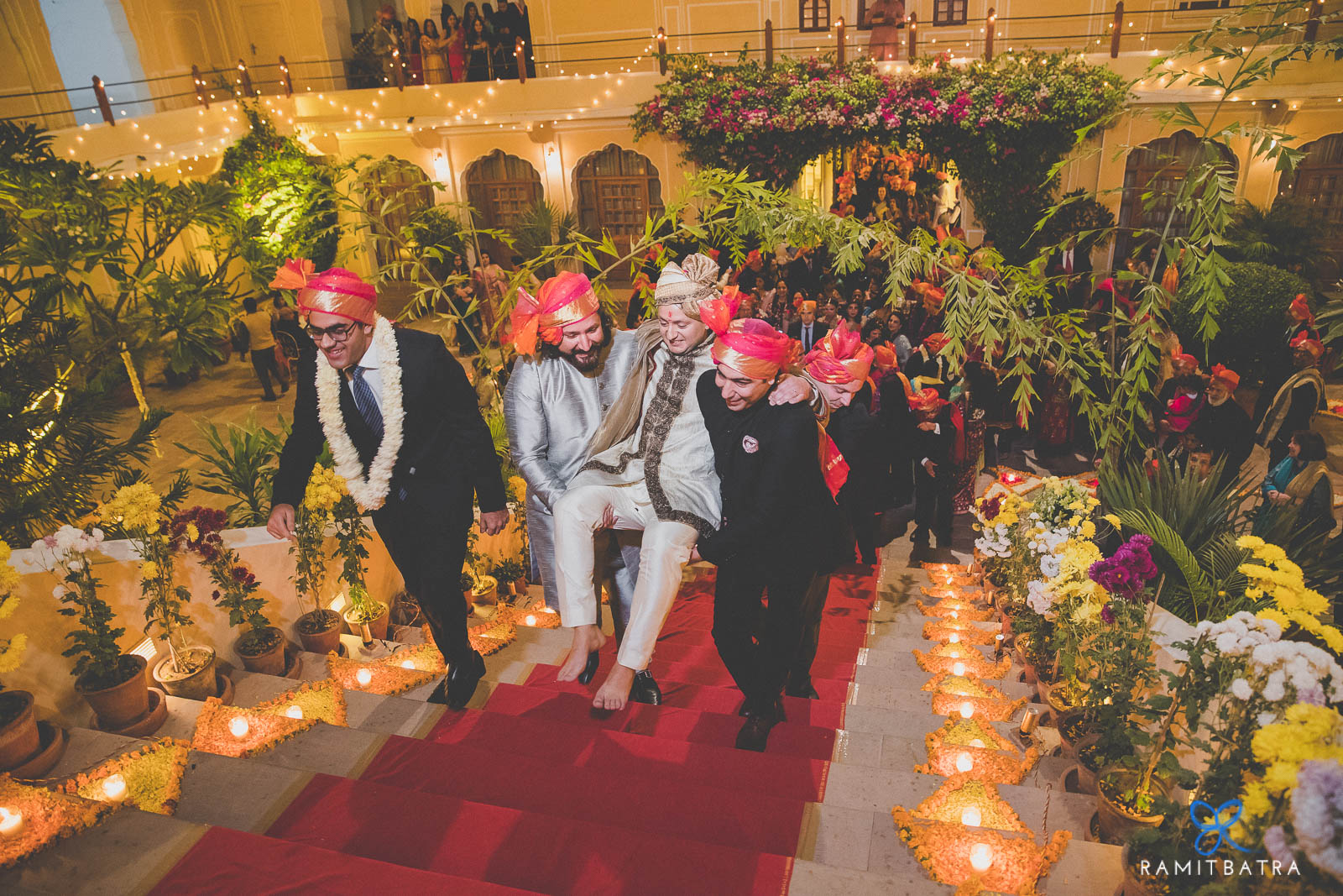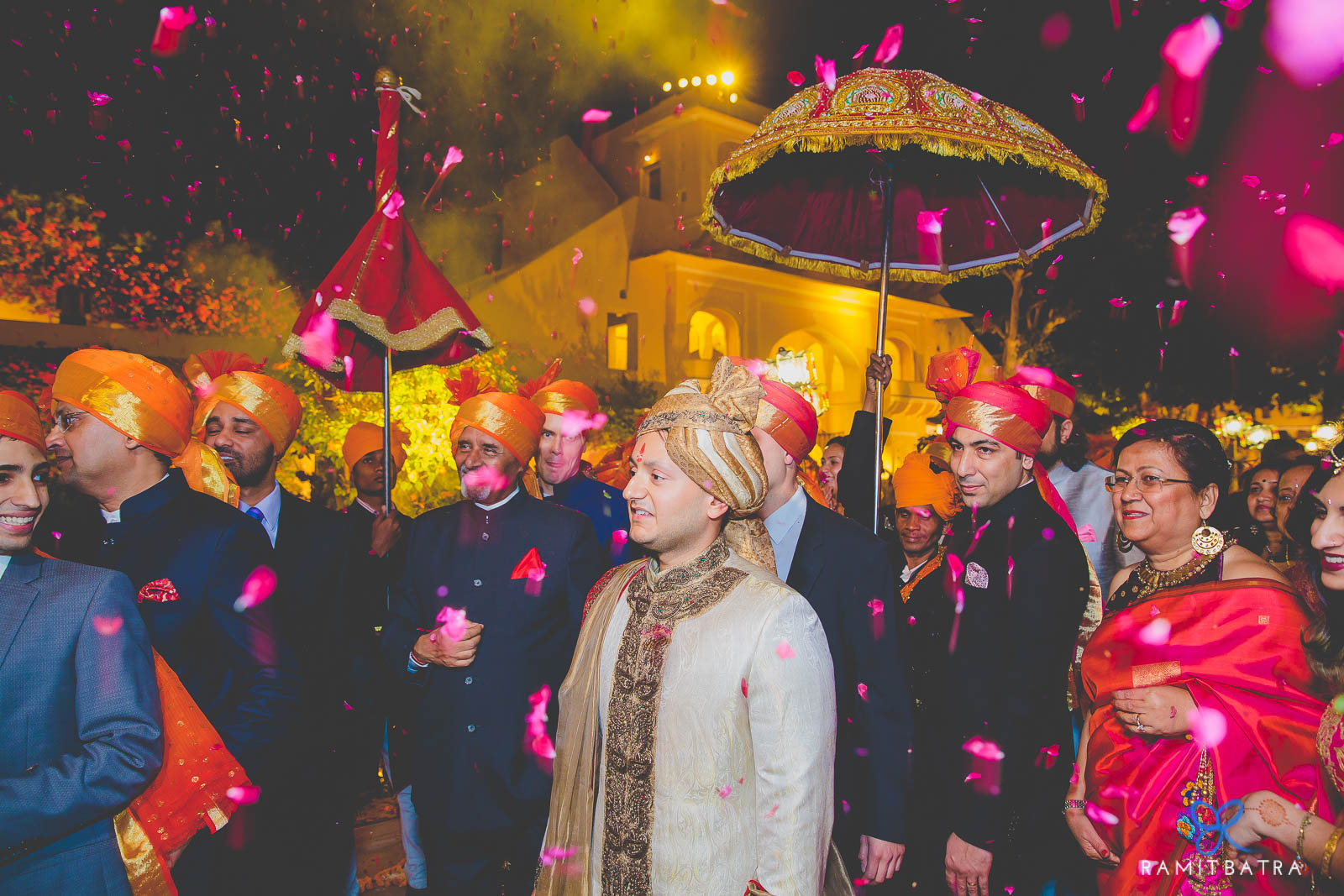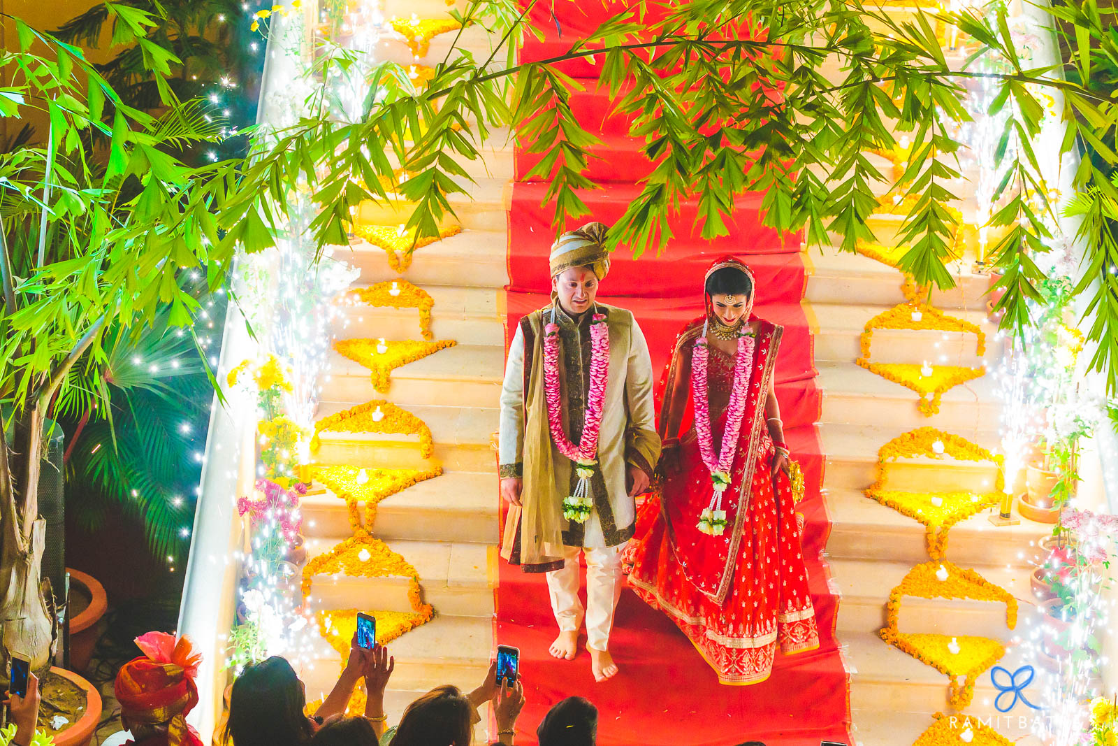 Ashima, escorted by her brothers and cousins, made a graceful entrance to the courtyard. Their garland exchange, complete with playful teasing and fireworks lighting up the palace steps, was pure magic.