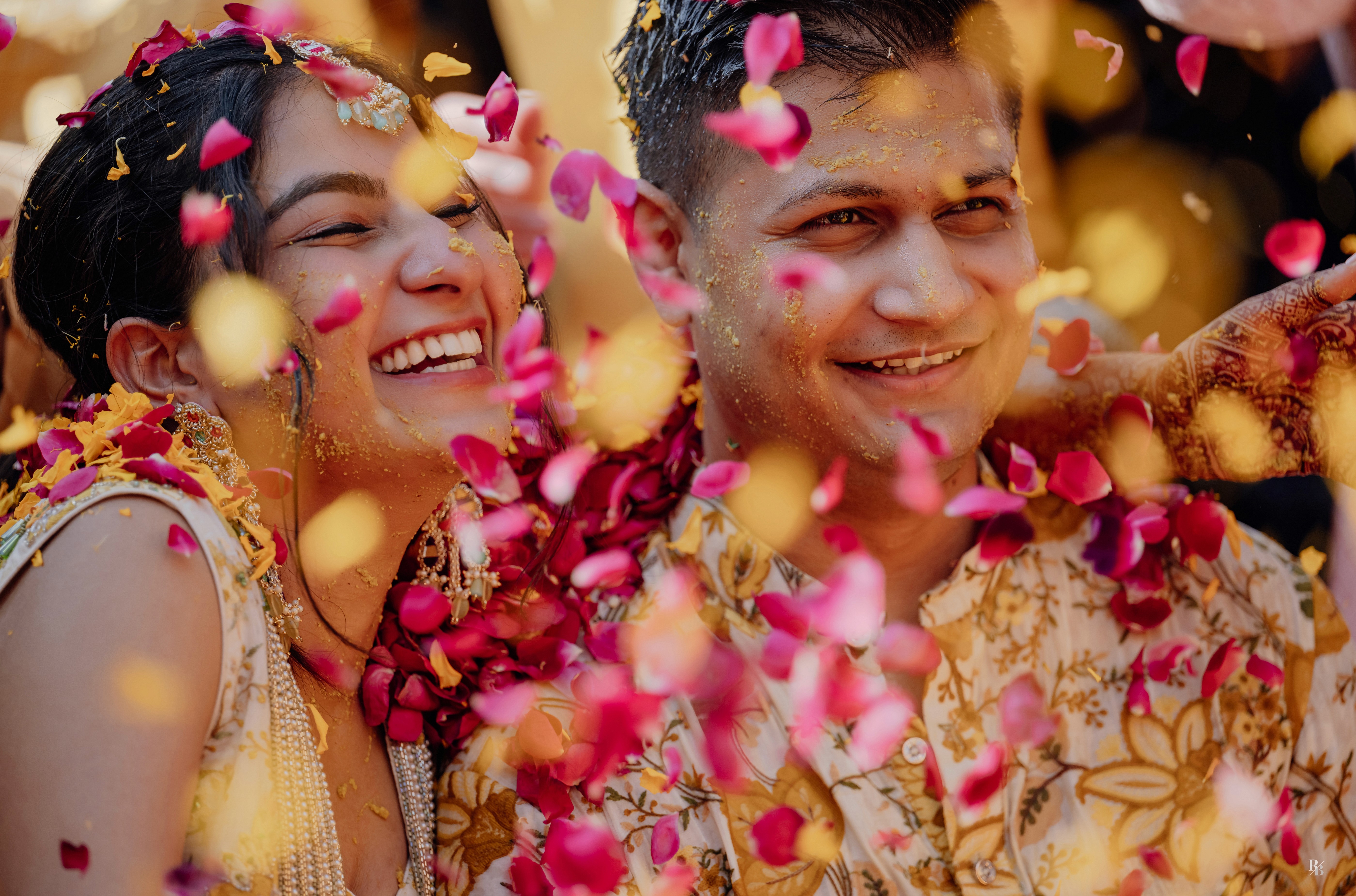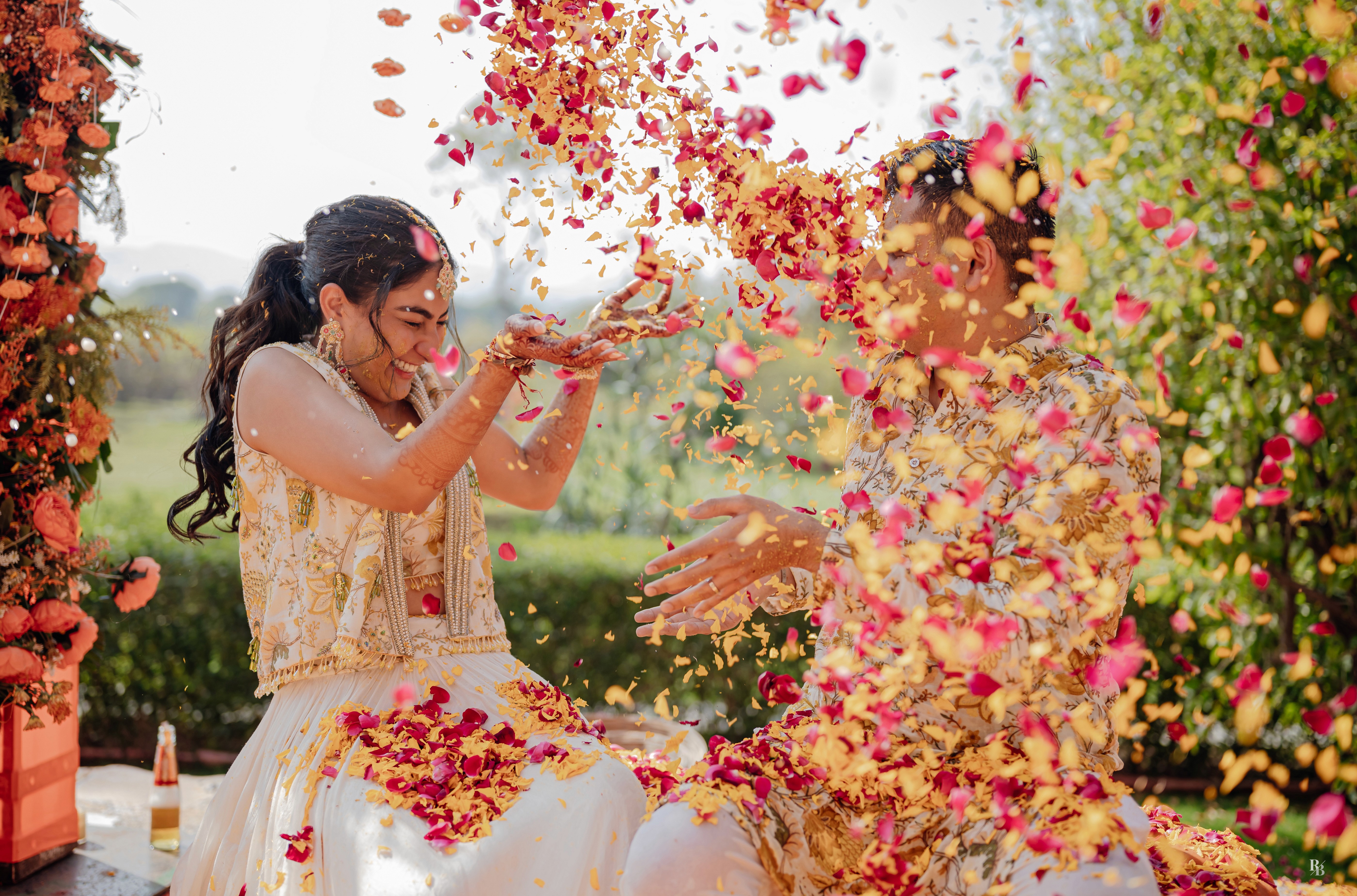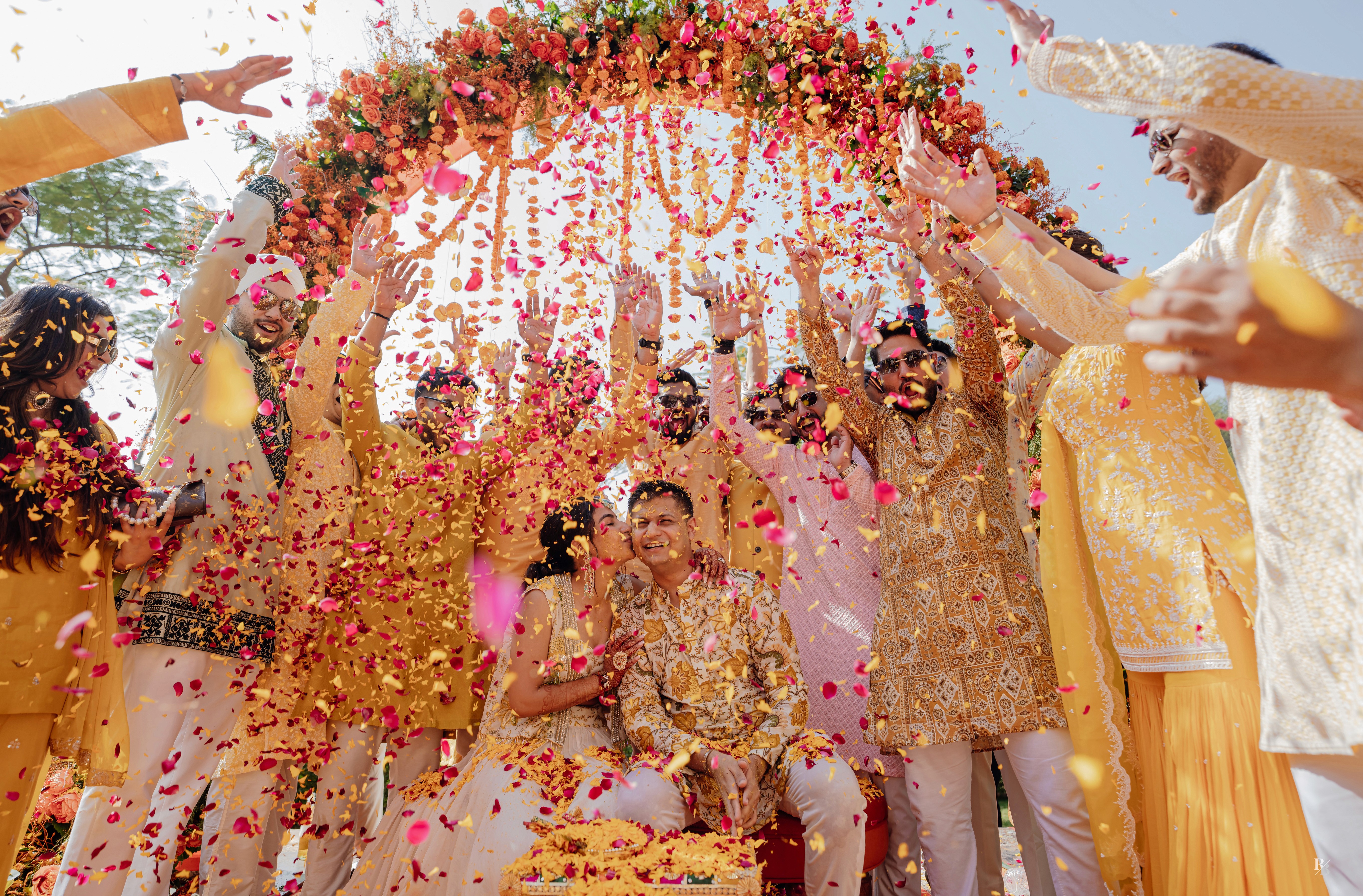 Nothing captures joy quite like the golden glow of haldi mixed with petals of pink and yellow.
