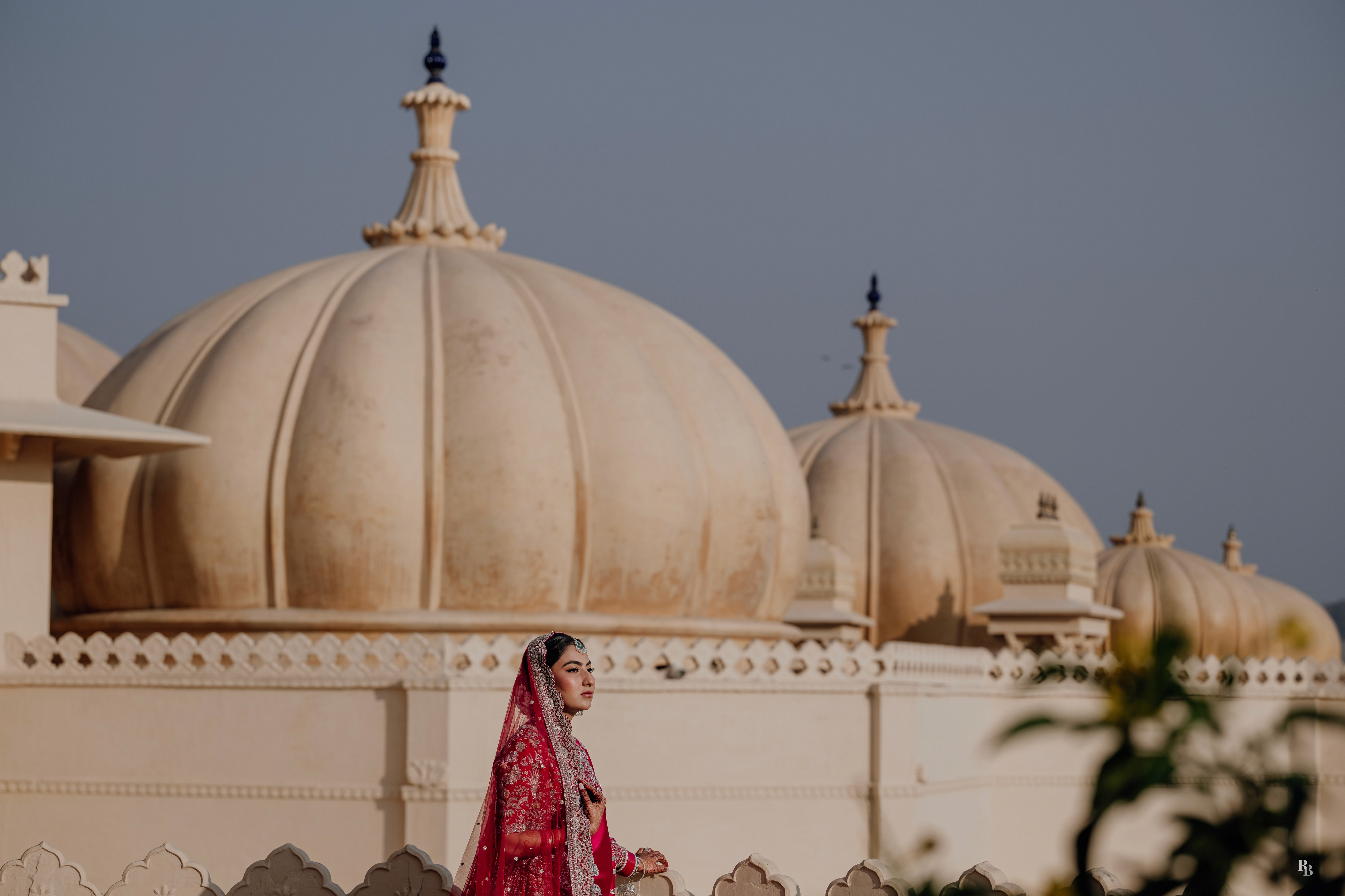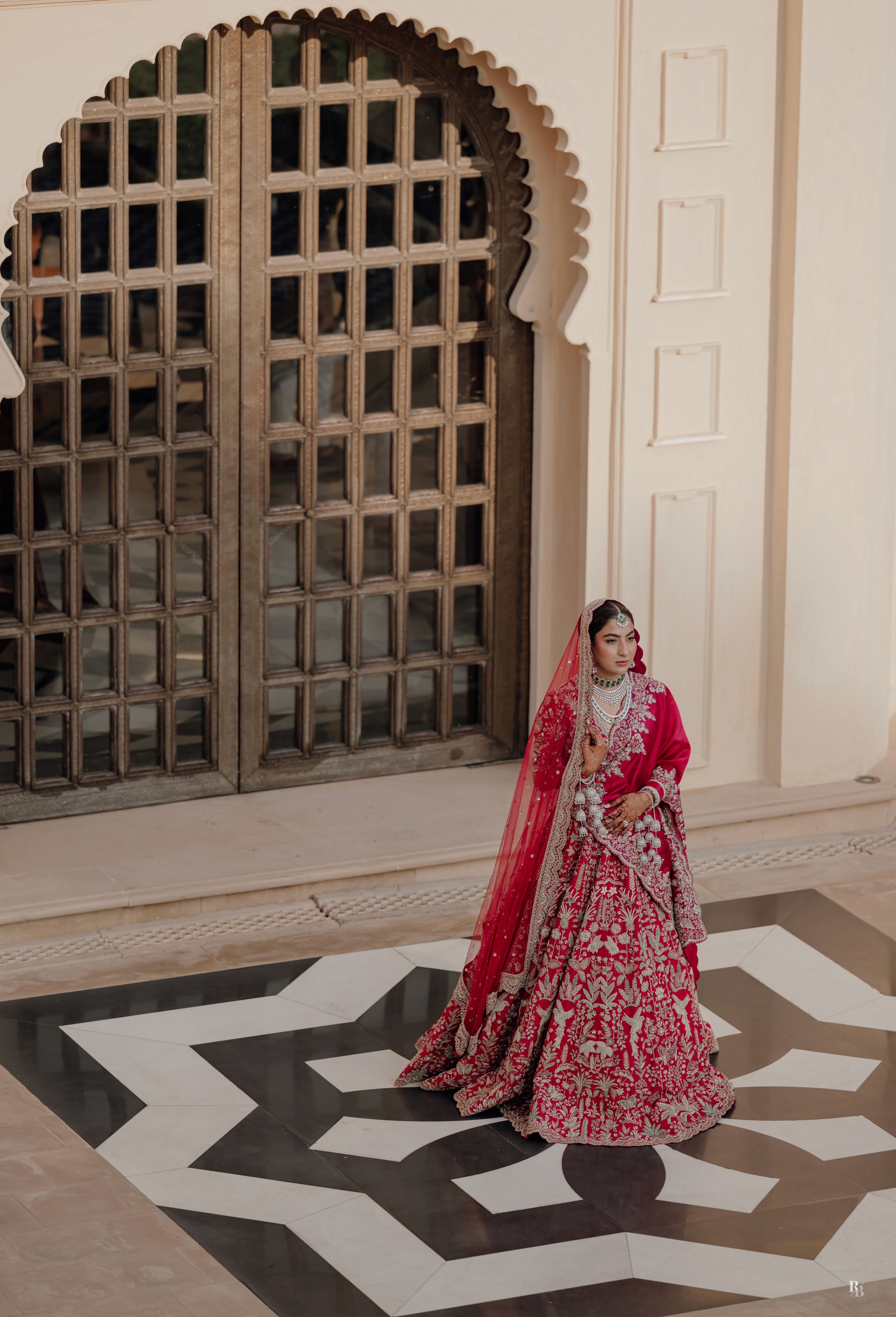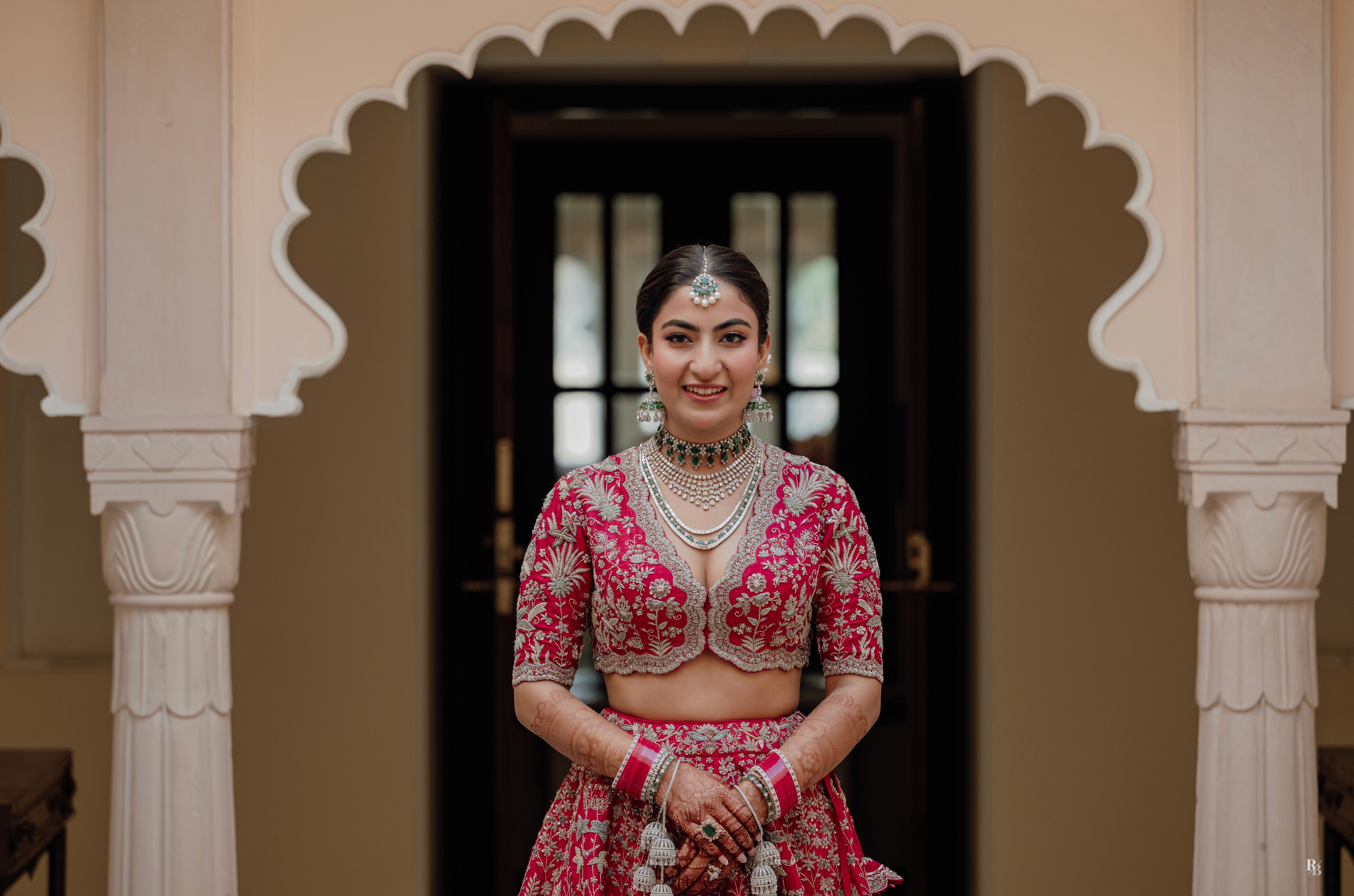 Shreya, draped in a Jayanti Reddy lehenga, was a vision of grace. The deep red fabric shimmered against the ivory arches of Udaivilas, her jewels catching the light as if they too rejoiced in her moment.