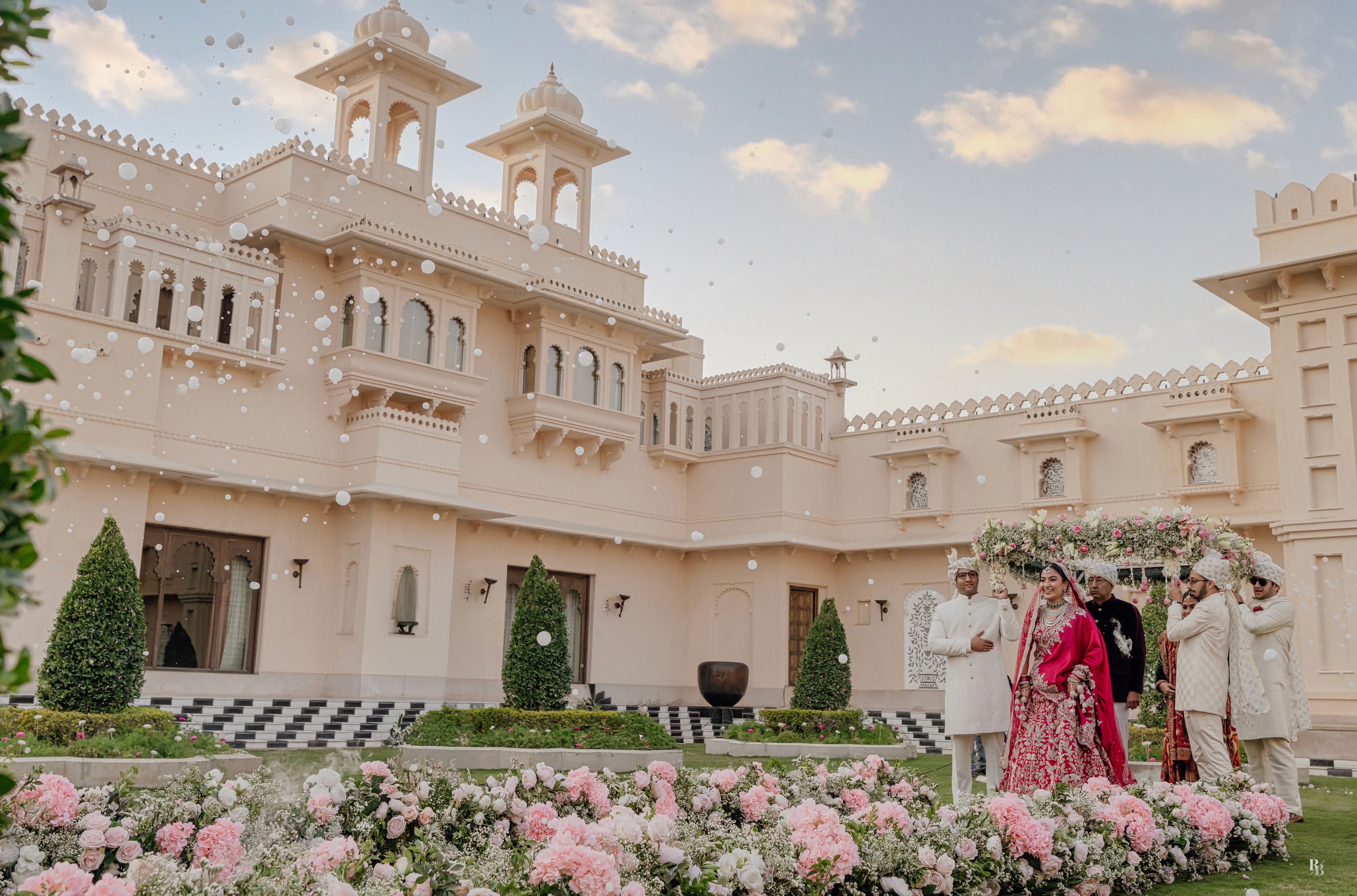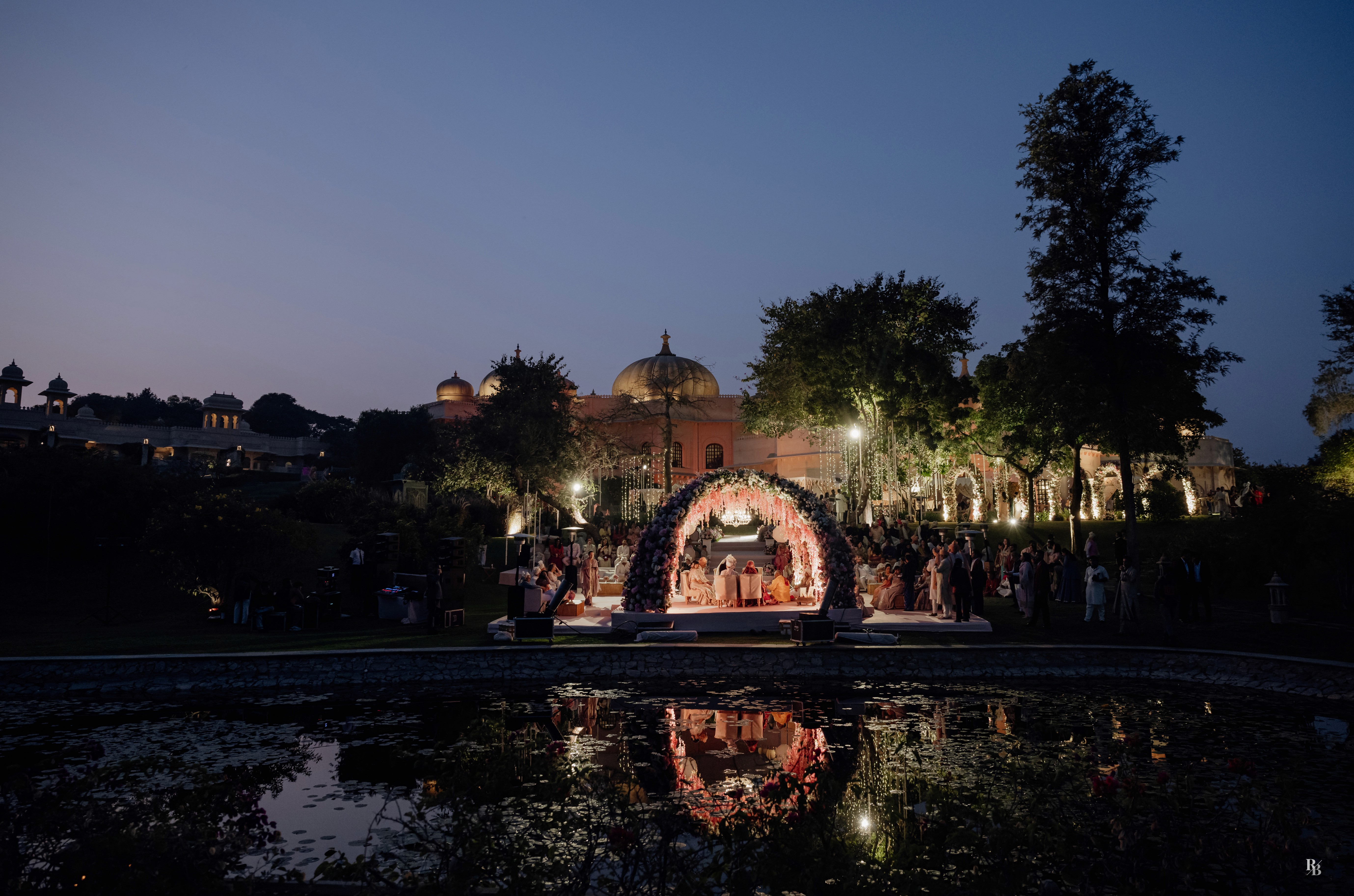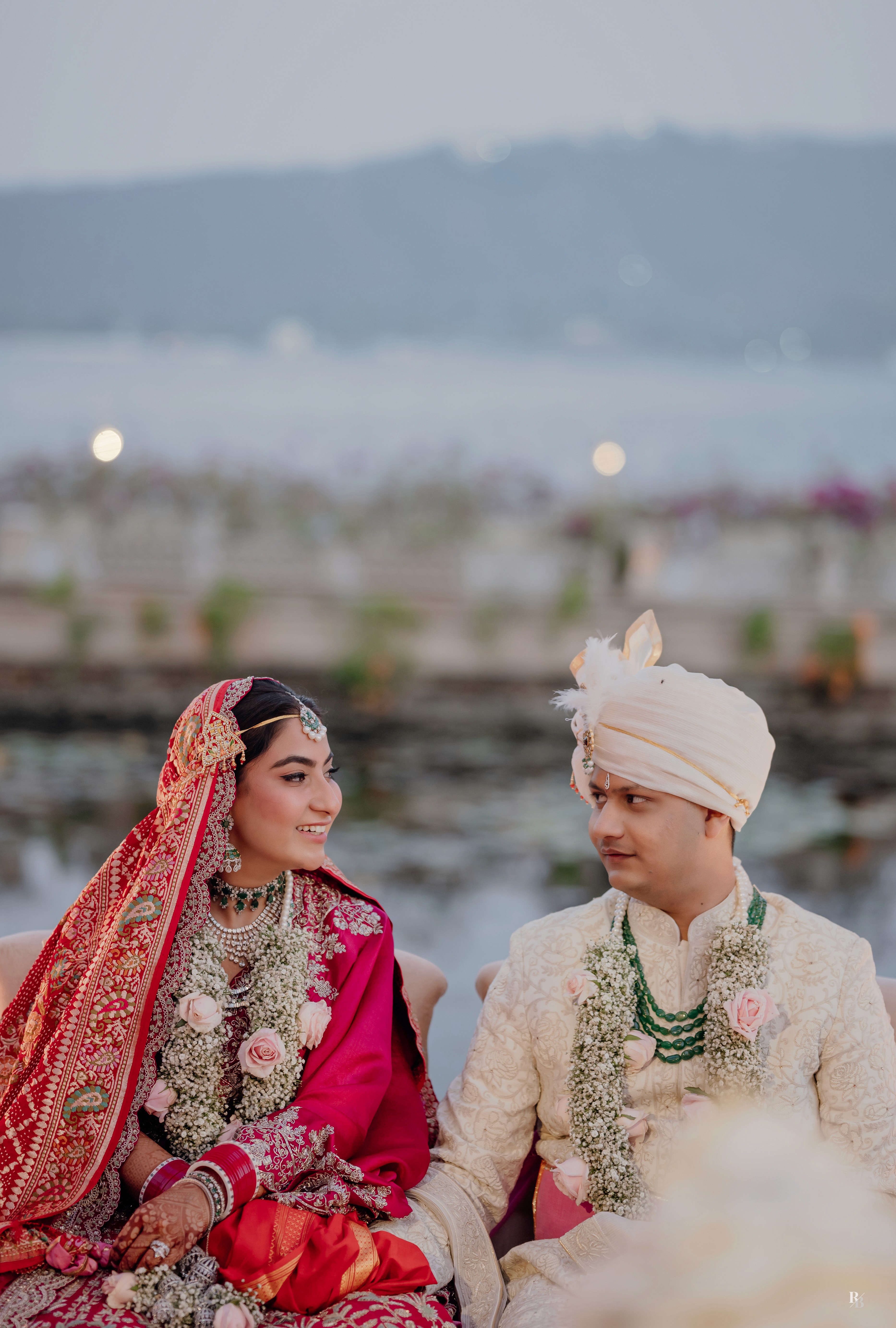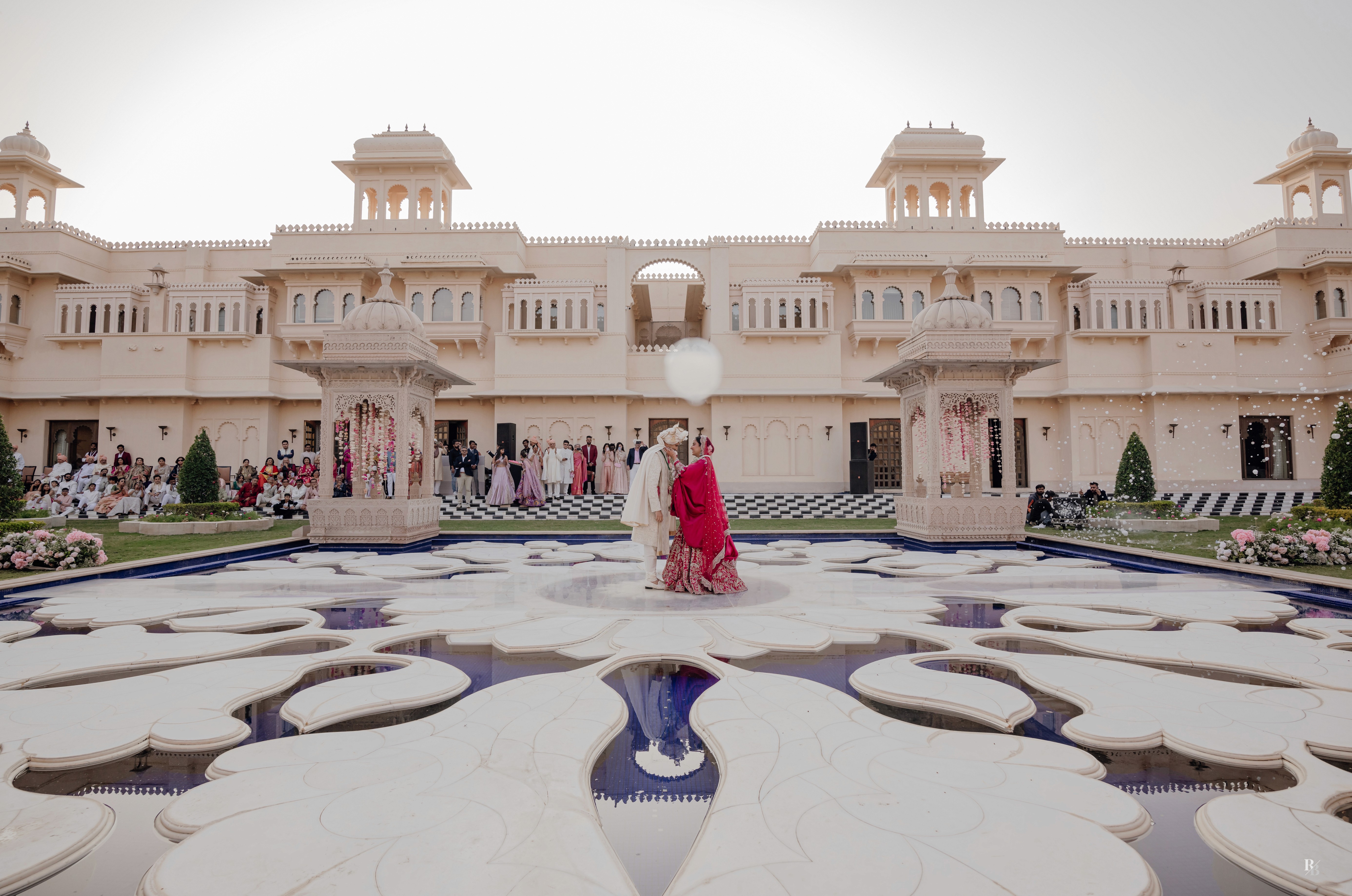 Their mandap — floating over the iconic lotus-shaped pool, dressed in pastel blooms by Desert Pearl Entertainment — was a sight to behold. With Lake Pichola shimmering in the distance, the setting itself seemed to bow down to the occasion.